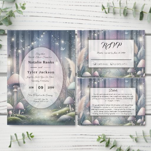 Invite a sus invitados a pasar una noche mágica bajo farolillos brillantes con este diseño de ensueño de la invitación a la boda. En un bosque de colores pastel con setas suavemente iluminadas, mariposas floridas y luces intermitentes, esta encantadora escena es perfecta para una romántica celebración llena de maravillas. Los tonos malolientes de rubor, lavanda y verde azulado suave crean una atmósfera de cuento de hadas para su momento más inolvidable.