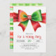 Large red and green bow Christmas holiday party Invitation. This festive Christmas holiday party invitation is adorned with a prominent, impressive red and green bow, featuring a delicate snowflake at its center. The reverse includes a playful pattern of varying red and green stripes, interspersed with charming snowflakes.
