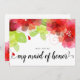 Flores rojas etéreas y escritura cursiva estilo caligrafía escrita a mano boda de primavera floral "¿Serás mi dama de honor?" tarjeta. Este bonito diseño muestra flores rojas y rosas con hojas verdes.