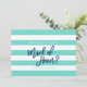Esta tarjeta preppy Will You Be My Maid of Honor incluye las palabras "Maid of Honor" en el moderno guión de broche azul contra un fondo turquesa y blanco de rayas. La tarjeta tiene una parte posterior azul. Consulte aquí los elementos coincidentes de la ducha de novia / Boda https://www.zazzle.com/collections/119250194970828530?rf=238364477188679314 Personalice esta tarjeta reemplazando el texto del marcador de posición en la plantilla para agregar su información. Para obtener más opciones, como cambiar el tipo de letra, el tamaño/color del texto y el espaciado entre letras, haga clic en el botón "Personalizar". *Tenga en cuenta que la marca de agua Zazzle que aparece en la vista previa del zoom NO aparecerá en el producto impreso final. © Rosewood y Citrus