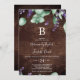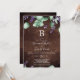Esta rústica invitación a una boda en un monograma de madera de lavanda es perfecta para un boda al aire libre sencillo y elegante. El diseño floral incluye hojas de eucaliptos acuáticas y vegetación con brotes de flores violetas sobre un fondo falso de madera. Personalice la tarjeta con su último monograma inicial.