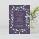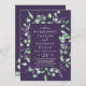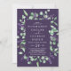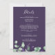 Este rústico lavanda con flores moradas en una sola invitación a la boda es perfecto para un boda al aire libre sencillo y elegante. El diseño floral incluye hojas de eucaliptos acuáticas y vegetación con brotes de flores silvestres moradas. Guarde el papel incluyendo los detalles en la parte posterior de la invitación a la boda en lugar de en una tarjeta separada. Incluya también la información de RSVP si su invitado responderá electrónicamente (opcional).
