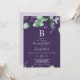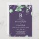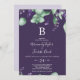 Esta rústica invitación a una boda en monograma morado de lavanda es perfecta para un boda al aire libre sencillo y elegante. El diseño floral incluye hojas de eucaliptos acuáticas y vegetación con brotes de flores violetas sobre un fondo de ciruela morada. Personalice la tarjeta con su último monograma inicial.