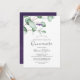 Esta rústica lavanda y eucalipto deja la invitación de Quinceañera es perfecta para una simple y elegante fiesta de cumpleaños al aire libre. El diseño floral incluye hojas de eucaliptos acuáticas y vegetación con brotes de flores silvestres moradas.