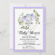 Elefante acuático en lavanda y gris rodeado de prisma geométrico de aspecto dorado con follaje eucalipto sobre el diseño de tarjeta de invitación a bebé con fondo de polka-punto de lavanda.