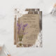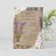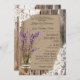 Rústico diseño de tarjetas de invitación a bodas occidentales de campo con ramo de lavanda en frasco de albañilería envuelto con burlap, encaje, encaje y encaje blanco y mellizo sobre el fondo de lino y tablones de madera envejecidos y un corazón grabado con monograma en la parte posterior.