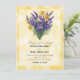 Invitación a una boda con un ramo de lavanda y daffodils sobre un fondo de papel de pergamino amarillo.