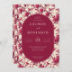 This is a vintage style image featuring an elegant wedding invitation surrounded by intricate red floral patterns. The rich maroon and cream color palette exudes sophistication and romance, making it perfect for a classic or traditional wedding theme. The oval-shaped central panel highlights the names "Lauren and Benjamin" along with the date and venue details in a refined script font. It feels like stepping into a charming garden party, inviting guests to celebrate love and joy. Ideal for those seeking a timeless and heartfelt wedding announcement.
