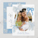Esta invitación de fiesta de graduación coquette presenta tu foto rodeada de lazos azul pálido dibujados a mano. El reverso presenta un fondo azul con un patrón de lazos. Personalízalo según tus necesidades. Puedes encontrar productos coincidentes en mi tienda.