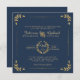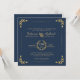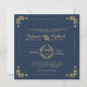 "Invitación a la boda moderna de la tipografía de la liga de oro de la Marina". Sencillo. Elegante. ¡Belleza eterna! Leña de Laurel con disposición de texto tipográfico en purpurina dorado con un color de fondo de azul marino rico. Arte de la artista y diseñadora con licencia internacional, Audrey Jeanne Roberts, copyright.