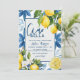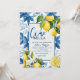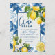 Invitaciones a la ducha con azulejos azules y limoneros mediterráneos.
