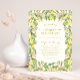 Invitación de Squeeze Principal Lemons. Invite a sus invitados a una celebración radiante con esta exquisita invitación a la ducha de novia de la colección "Main Squeeze". Cada invitación incluye un delicado marco de limones pintados a mano, exuberante vegetación y suaves flores de limón sobre un elegante fondo de marfil, complementado con un sofisticado texto de oro y escritura. El lado inverso continúa con el tema con un patrón de correspondencias, creando una apariencia armónica e invitante que bellamente prepara el escenario para una memorable reunión de inspiración mediterránea.