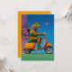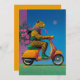 Una obra de arte vibrante y surrealista en la que aparece un leopardo montando una moto naranja brillante contra un cielo azul intenso. Con rosas rosas rosas en el fondo y una elegante bufanda violeta, esta escena mezcla vida salvaje y frescura urbana, creando una visión caprichosa y llamativa.