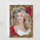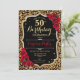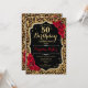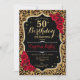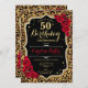 Elegante invitación femenina de 50 años con tu foto al fondo de la tarjeta. Diseño negro de cristal con estampado de leopardo animal y oro falso purpurina. Cuenta con rosas rojas, fuente de guión y confiti. Perfecto para un elegante fiesta de celebración de cumpleaños. Personaliza con tus propios detalles. ¡Se puede personalizar para cualquier edad! Invitaciones Zazzle impresas o una plantilla imprimible digital de descarga instantánea.