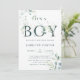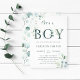 Es una invitación para un niño a la ducha de bebé con eucalipto de color de agua pintado y hojas verdes con letras botánicas verdes. Para una personalización más avanzada de este diseño, haga clic en el vínculo Personalizar adicional para cambiar el tipo de letra, el tamaño y el color.