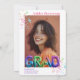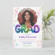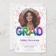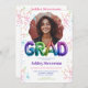 Celebra al graduado con estilo con esta invitación de graduación con letras de globos holográficos vibrantes y modernos. Con dos espacios para fotos personalizables, este diseño divertido y festivo está decorado con confeti brillante y texto de globos llamativos que deletrean "GRAD" en tonos metálicos de arcoíris. Los bordes redondeados añaden un toque elegante, mientras que la mezcla de tipografía juguetona y negrita la convierte en una opción destacada para cualquier celebración de graduación de escuela secundaria o universidad. ¡Perfecta para anunciar el gran hito con un ambiente divertido y enérgico!
