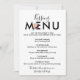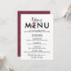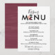 Este menú de beso con letras florales granate es perfecto para una recepción de boda de otoño. El diseño presenta un pequeño ramo de flores granate y melocotón sobre tipografía en negrita para un look moderno y elegante. El respaldo presenta pinceladas de acuarela marsala.