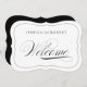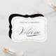 Letrero de boda clásico y discreto en negro y blanco con un toque moderno que presenta la elegante escritura de la palabra "Bienvenida" y un borde negro. Marco para el lugar de su boda, mesas de ceremonia y recepción para guiar a los invitados.