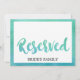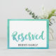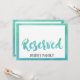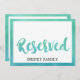 Este letrero de "reservado" de boda de playa con caligrafía de acuarela es perfecto para una boda con tema de destino tropical. El diseño divertido y energético presenta una hermosa fuente de escritura de acuarela con gradiente de verde azulado y azul aqua. Utilice estas tarjetas para reservar sillas o mesas en su ceremonia de boda o recepción. Diseñado con cuidado por Miriam en Fresh & Yummy Paperie. Para artículos coordinados, visite mi tienda Zazzle: