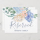 Esta señal de boda de flores azules polvorientas "reservado" es perfecta para una boda de primavera o verano. La tarjeta es de doble cara (imprime en ambos lados). El delicado diseño presenta peonías azules claras dispuestas con flores de durazno y crema en un hermoso ramo. Utilice estas tarjetas para reservar sillas o mesas en su ceremonia de boda, recepción o cualquier evento.