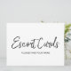 Un elegante letrero con letras a mano que dice "Tarjetas de acompañante por favor encuentre su nombre"