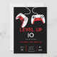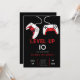 Level Up 10 video game birthday party invitation featuring a bold black background, two white game consoles, and striking red accents. A modern, high contrast design perfect for celebrating a gamer’s 10th birthday in epic style.