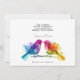 En la colección Rainbow Lovebirds, la invitación a la boda tiene un diseño horizontal para una presentación moderna. En el frente, una cautivadora obra de arte acuática muestra dos intrincadamente representadas aves enfrentadas entre sí en medio de los vivos colores de la bandera del orgullo LGBTQ+, simbolizando la profunda conexión de la pareja. Alineados en el lado derecho del frente, los detalles del boda, incluidos los nombres de la pareja, la fecha del boda y la ubicación, se muestran de manera elegante y sofisticada. En la parte posterior, la izquierda presenta la misma obra de arte impresionante, manteniendo la continuidad visual y la coherencia temática. En el lado derecho, en lugar de una foto, hay amplio espacio para un mensaje personalizado de la pareja. Esta zona les permite expresar gratitud, dar instrucciones especiales o transmitir sentimientos sentidos a sus invitados. Imprimida en un material de cartón de alta calidad con un acabado liso, la invitación exuda sofisticación y lujo, con colores nítidos y vibrantes que realzan el atractivo visual. Esta disposición horizontal ofrece un diseño fresco y contemporáneo, que le da el tono perfecto para una memorable celebración del amor y la inclusión.