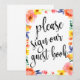 Una elegante señal de boda de vanguardia, presenta el texto "por favor firme nuestro libro de invitados" en una fuente de escritura extrovertida, la textura de pincel añade un sentimiento espontáneo y juguetón. El color de fondo se puede personalizar según tus necesidades y preferencias, por favor contáctame si tienes alguna solicitud especial.