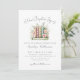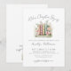 Un nuevo capítulo comienza. Celebre a la futura novia con esta linda y elegante invitación de baby shower con temática de libro. En la parte superior, "Un nuevo capítulo comienza" está escrito en una suave letra manuscrita, estableciendo un tono dulce y alegre para la celebración. Justo debajo, una pila de libros en acuarela aparece en tonos pastel de rosa, azul teal, naranja y amarillo. Delicadas flores rosas y suaves hojas verdes rodean los libros, creando un punto focal encantador y femenino.