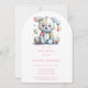 Esta ilustración contiene un osito de peluche lindo y caprichoso con un parchado floral cosido a mano en acuarela, con un globo parchado sobre un fondo blanco simple. Invitaciones y suministros para fiestas a juego están disponibles en esta suite de colección.