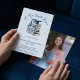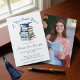 Libros de toile azules y blancos Anuncios de Invitaciones de Graduación de Nuevo Capítulo. Celebre un hito con este elegante anuncio de graduación azul y blanco y la invitación a la casa abierta. Con una pila de libros antiguos bellamente ilustrados con un sombrero de graduación, este diseño simboliza el comienzo de un nuevo capítulo en la vida. La delicada escritura y la paleta de colores clásica crean un aspecto atemporal y sofisticado. Personalice con el nombre del graduado, la escuela y los detalles del evento para hacerlo único. Perfecto para los amantes de los libros y los logros académicos, esta invitación establece el tono para una celebración memorable.