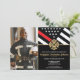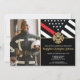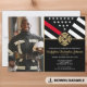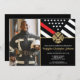 Este diseño cuenta con una bandera de bomberos con rayas blancas y negras y una delgada franja roja. Una insignia de bombero se sienta sobre todo los detalles del fiesta para el bombero que se graduó, que está al lado de una foto del nuevo graduado de la academia de bomberos. Este diseño también funciona bien para un bombero, teniente o fiesta de retiro en jefe.