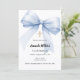 A white background, decorated with a light blue large bow and a golden cross. Personalize and add a name and details details.
