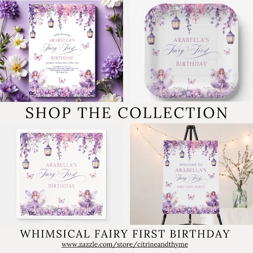 ¡Celebra el mágico primer cumpleaños de tu pequeña con esta encantadora invitación de cumpleaños "Fairy First"! Hermosas flores de lila y púrpura, lámparas colgantes, mariposas y hadas caprichosas adornan esta invitación histórica. Invite a sus invitados a unirse a la magia mientras celebran este inolvidable primer cumpleaños.