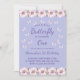 Celebra el primer cumpleaños de tu mariposa pequeña con estas encantadoras invitaciones a la fiesta de cumpleaños de la mariposa. Perfecto para un día especial para una niña, cada invitación incluye delicadas mariposas color rosa y púrpura que fluyen entre las flores rosa rubor en una escena de jardín caprichosa. El diseño está muy bien decorado con un polvoriento fondo azul, creando un ambiente encantador y sereno. La frase "Nuestra mariposa se está volviendo una" está elegantemente programada, y hay un espacio para personalizar con el nombre de su hijo en un elegante tipo de letra de guión. Estas invitaciones le darán un toque mágico a la celebración de su fiesta de primer cumpleaños.
