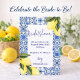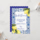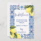 Elegante invitación de despedida de soltera con limones de acuarela brillantes y acentos de azulejos italianos azules. Personalizable para celebraciones de boda de verano o con tema mediterráneo.