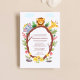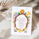 el diseño de la fachada muestra un marco de madera con muchos animales y hojas pegadas y una invitación escrita a la ducha de bebé en marrón en el medio. este diseño es muy bonito y perfecto para la ducha de bebé.