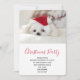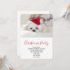 Invitación a la fiesta de Navidad con una adorable foto de un lindo perrito blanco que lleva un sombrero rojo de Navidad.