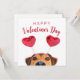Ilustración adorable y feliz del día de San Valentín con un perro curioso que lleva una vincha roja con corazón. Saludo de temporada escrito en letras de tipografía moderna.