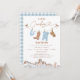 Línea de ropa azul occidental Little Cowboy Baby Shower Invitation Cowboy Cowboy con temas como la ropa de bebé, le invitan a una ducha de bebé con algo de ropa de bebé, botas de vaquero, gorra de vaquero y bufanda. Esta pequeña invitación a la ducha de bebé de vaquero también tiene una imagen occidental del desierto en azul y marrón y una caligrafía moderna que se dirige con un corazón.