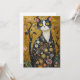 Esta imagen muestra un impresionante gato representado en el estilo artístico que recuerda a Gustav Klimt. El gato, con sus ojos amarillos llamativos, piel blanca y negra, y sus intrincados patrones giratorios en su cuerpo, exudan un aura majestuoso y misterioso. Los tonos dorados, las formas orgánicas y los motivos florales de la decoración se mezclan perfectamente con la figura del gato, adornada con motivos circulares ornamentales y delicados adornos. El conjunto es una fusión fascinante de belleza natural y un diseño lujoso y ornamental.