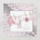Cabinas rosa, pacificador, botellas y conejito adorables en una invitación a la ducha de una bebé damasquinada rosa y gris. Puede personalizar fácilmente esta elegante invitación a una ducha de bebé gris y rosa dulce añadiendo los detalles del evento, el estilo del tipo de letra, el tamaño y el color del tipo de letra y la redacción.