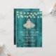 Rústica Linterna y cuerda iluminan invitaciones Verde azuladas a la boda de un granero.