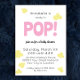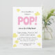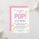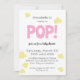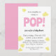 Esta personalizado de ducha de bebé para una niñita tiene un adorable tema de palomitas. Los amables núcleos de palomitas de maíz personalizado acentúan los lados y el fondo de la invitación. La palabra "POP" se imprime en un color bebebe suave rosado para aquellos que esperan un chica. La parte de atrás es rosa a juego.