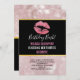 Fiesta de cumpleaños con un fondo compuesto de hojas tropicales de oro rosa. Encaramado sobre la parte superior hay un marco negro con un borde falso purpurina dorado, dentro están los labios purpurinoso rosados.