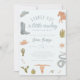 Carta de invitación a la ducha de bebé de un chico lindo con ilustraciones de botas de vaquero, caballo, serpiente, cráneo, cactus, gorras de vaquero, etc. El texto dice "¡monten! Un pequeño vaquero está en camino"