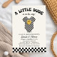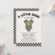 Esta bonita y elegante ducha de bebé está decorada con un traje de bebé a bordo y una cara de sonrisa amarilla de estilo retro. La tipografía retro dice: "¡Un pequeño tipo está en camino!" Un diseño de tablero de ajedrez blanco y negro acentúa la parte inferior y trasera de la invitación. ¡Perfecto para un niño en camino!