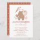 Esta encantadora ducha de bebé está decorada con un bonito color de terracota naranja y rojo, beige, blanco roto, gris, rosa claro y dorado naranja. El diseño principal contiene un pequeño saltador de verano, un gorra con una flor, un loro, una cámara y un pequeño acento de hoja. El texto principal, que dice "Un Pequeño Explorador está en camino", contiene un pequeño acento de lupa. La parte trasera de la invitación tiene un patrón de sol sobre un fondo de terracota.