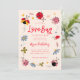 Carta de invitación a la ducha de bebé con ilustracion de flores, flores y estrellas. El texto dice "un pequeño insecto de amor está en camino".