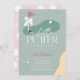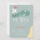 This retro modern "a little putter on the way" girl's baby shower invitation features a pink flag with a white bow and golf balls with a fairway and bunker in a golf course. The reverse side features a light pink background with a golf ball and tee pattern. Personalize it for your needs. You can find matching products at my store.